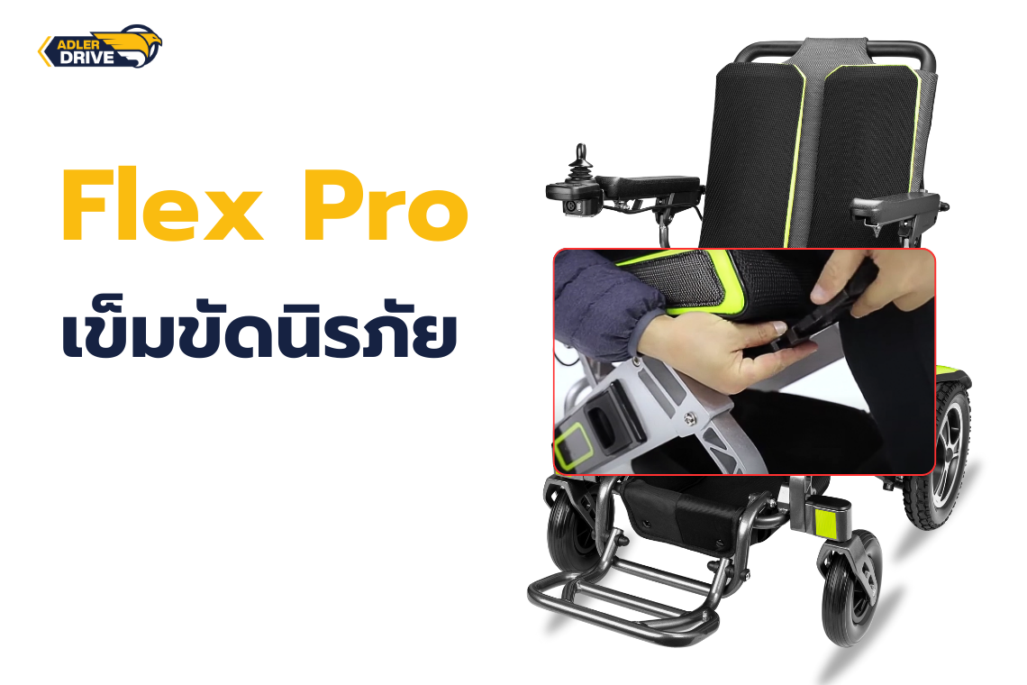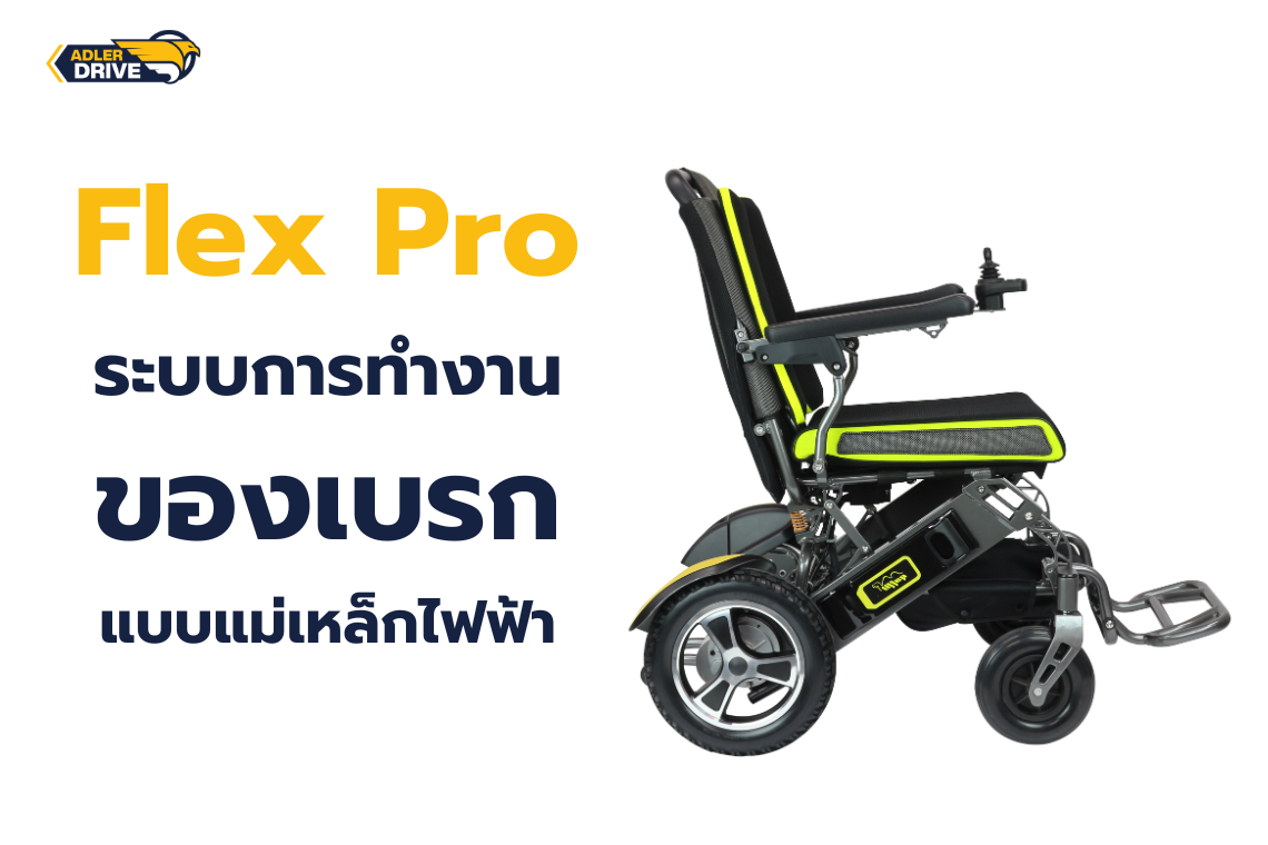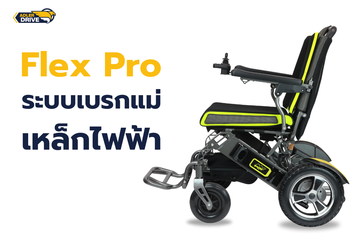 รถเข็นไฟฟ้า ยี่ห้อ Adler Drive รุ่น FIex Pro รถเข็นไฟฟ้าดีไซน์สอร์ต รุ่นท็อปสามารถนำขึ้นเครื่องบินได้ พับเก็บง่าย เคลื่อนย้ายสะดวกที่สถานที่ มาพร้อมระบบความปลอดภัยด้วยการเบรกแบบแม่เหล็กไฟฟ้า เพียงแค่ปล่อยมือจากคันโยกที่ใช้บังคับทิศทาง (Joy stick) รถเข็นก็จะหยุดได้ทันที เนื่องจากระบบเบรกแม่เหล็กไฟฟ้า จะไม่สามารถทำงานได้ หากแหล่งไฟฟ้าถูกปิดลง มอเตอร์จะหยุดทำงานและล้อก็จะหยุดหมุนทันที สำหรับผู้ที่กำลังมองหารถเข็นไฟฟ้าฟังก์ชันการใช้งานครบครัน ตอบรับทุกการใช้งานและยังได้รับมาตรฐานคุณภาพจากประเทศสหรัฐอเมริกา FDA และการรับรองผลิตจากโรงงานที่ได้รับมาตรฐานระดับสากล ISO และมาตรฐาน CE