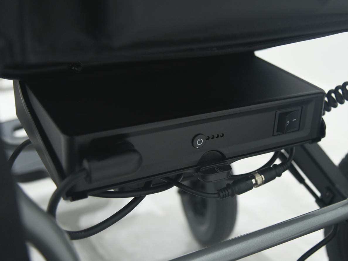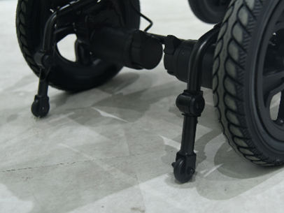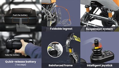 ผลิตโครงรถเข็นจากจากเหล็ก พ่นกันสนิม สีดำ แข็งแรงทนทาน ล้อทำด้วยยางตันโพลียูรีเทน (PU)ไม่จำเป็นต้องเติมลมส่วนโครงของล้อนั้นผลิตจากอะลูมิเนียม ทำให้ล้อยึดติดกับถนน ขับเคลื่อนได้ดี ใช้มอเตอร์ในการทำงาน สามารถต่อสายชาร์จกับรีโมทควบคุมเอาไว้ได้ ฐานพักเท้าผลิตจากพลาสติก พับได้ สามารถลุกยืนได้สะดวก และไม่โดนสิ่งกีดขวางบนพื้นถนน ขนาดเบา น้ำหนักเพียงแค่ 14.5 กก. สามารถเลือกระบบการใช้งานทั้ง 2 แบบ ทั้งการควบคุมด้วยไฟฟ้าโดยผู้นั่ง และการควบคุมโดยผู้ช่วยเข็นรถเข็น สามารถเดินทางได้มากถึง 10-15 กม.