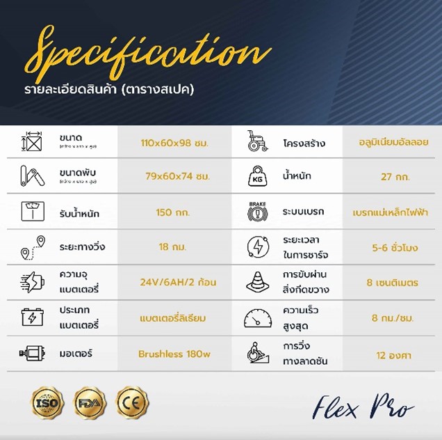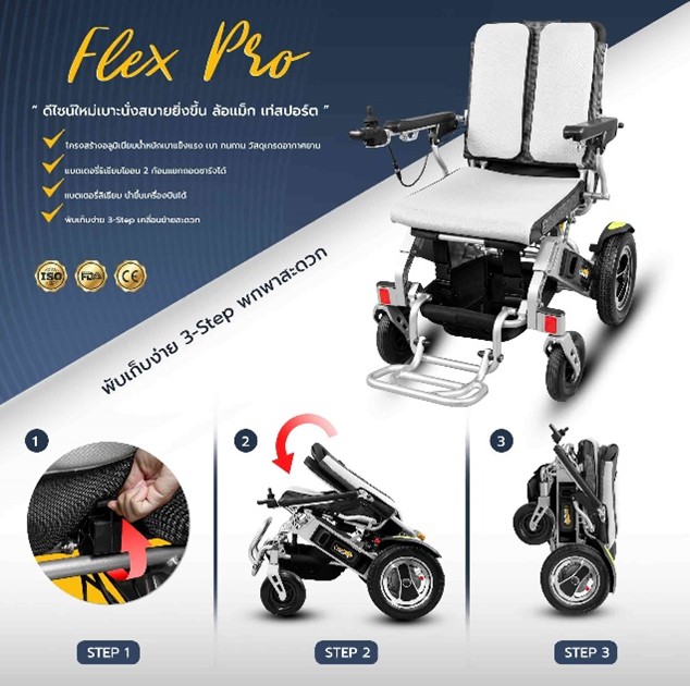 ตัวนี้จะต่างจาก Flex pro ตรงที่ด้านล่างของรถเข็นมาพร้อมกับตะกร้า ที่สามารถเก็บของได้ สะดวกในการเดินทาง เบาะสามารถถอดออกมาซักได้ สามารถชาร์จแบตเตอรี่แบบ Off-board ได้ ตัวแบตเตอรี่เป็นแบบลิเธียม 24 โวลต์ 11 แอมแปร์ น้ำหนักเบา ทนทานต่อการเสื่อม วิ่งได้ไกล 15-18 กม. แต่กระบวนการผลิตใช้วัสดุเดียวกัน มีระบบเบรกภายในตัว สามารถรองรับน้ำหนักได้มากถึง 150 กก. เหมือนกัน น้ำหนักของตัววีลแชร์คือ 26 กก.