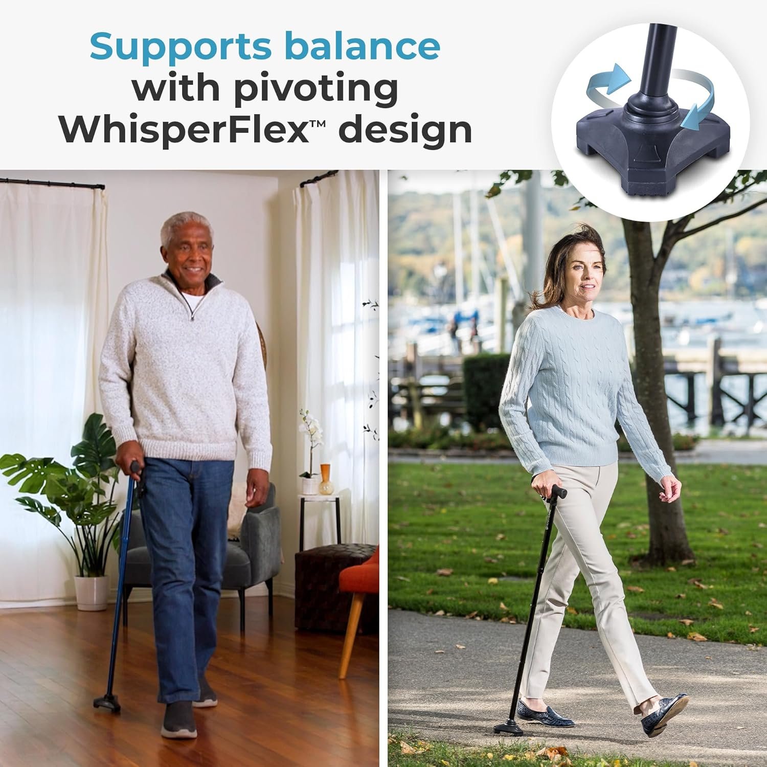 - ฐานหมุน/ข้อหมุน (Pivoting / “Ankle motion”) สามารถเอียงไม้เท้าได้ โดยฐานยังคงสัมผัสพื้น ช่วยให้ทรงตัวดีเวลาลุก-นั่ง มีข้อหมุนที่ช่วยให้ฐานขยับได้เมื่อไม้เท้าเอียงหรือเคลื่อน ซึ่งช่วยให้ยังมีจุดสัมผัสกับพื้นได้บ้าง เวลาเอียงตัวขึ้น ลง นั่ง ลุก เป็นต้น — ไม่ให้ไม้เท้าหลุดหรือไถลไปที่ด้านข้างง่าย ๆ